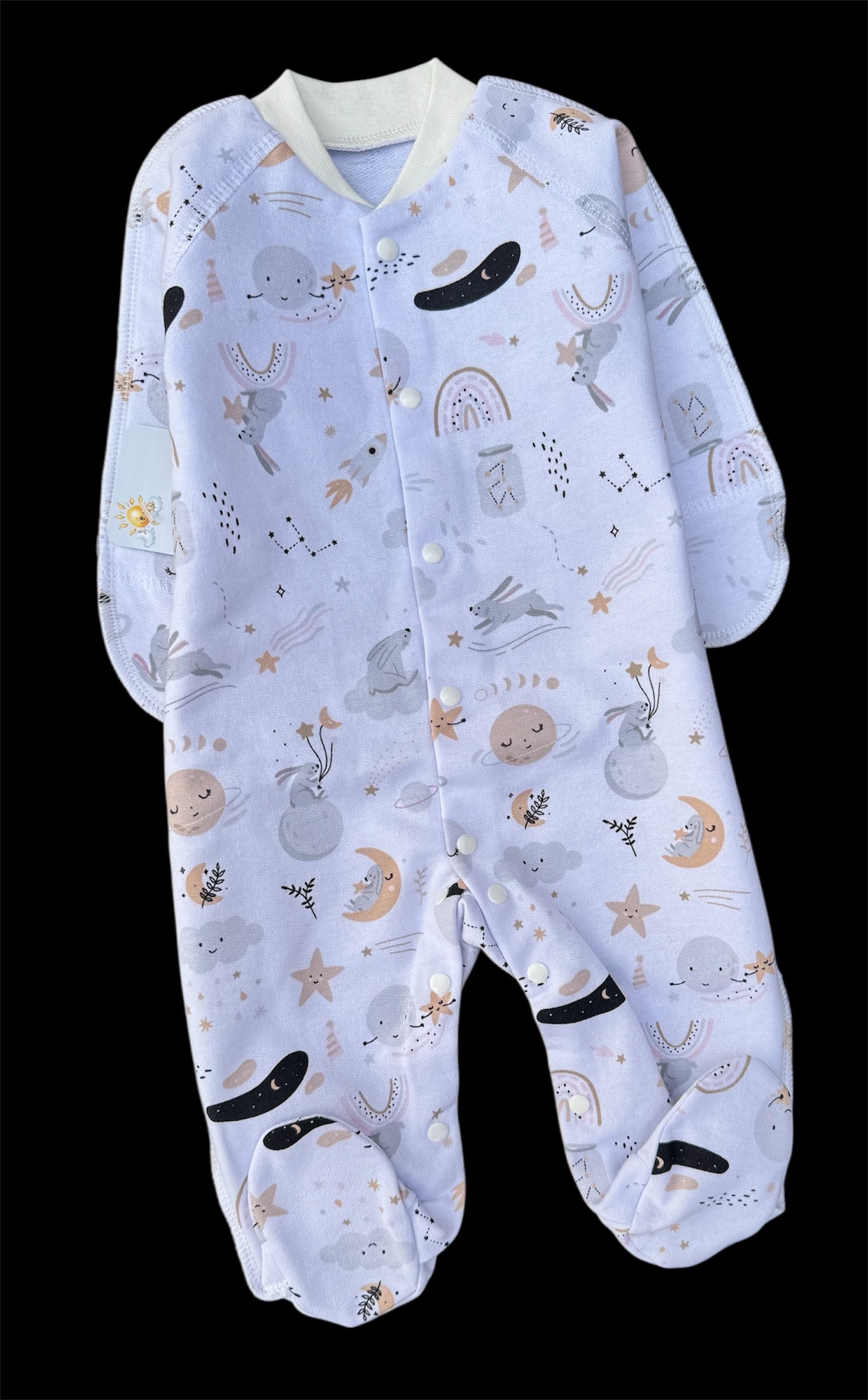 На рукавах комбінезона манжети-антицарапки, застібки - зручні кнопочки, щоб швидко переодягнути малюка.