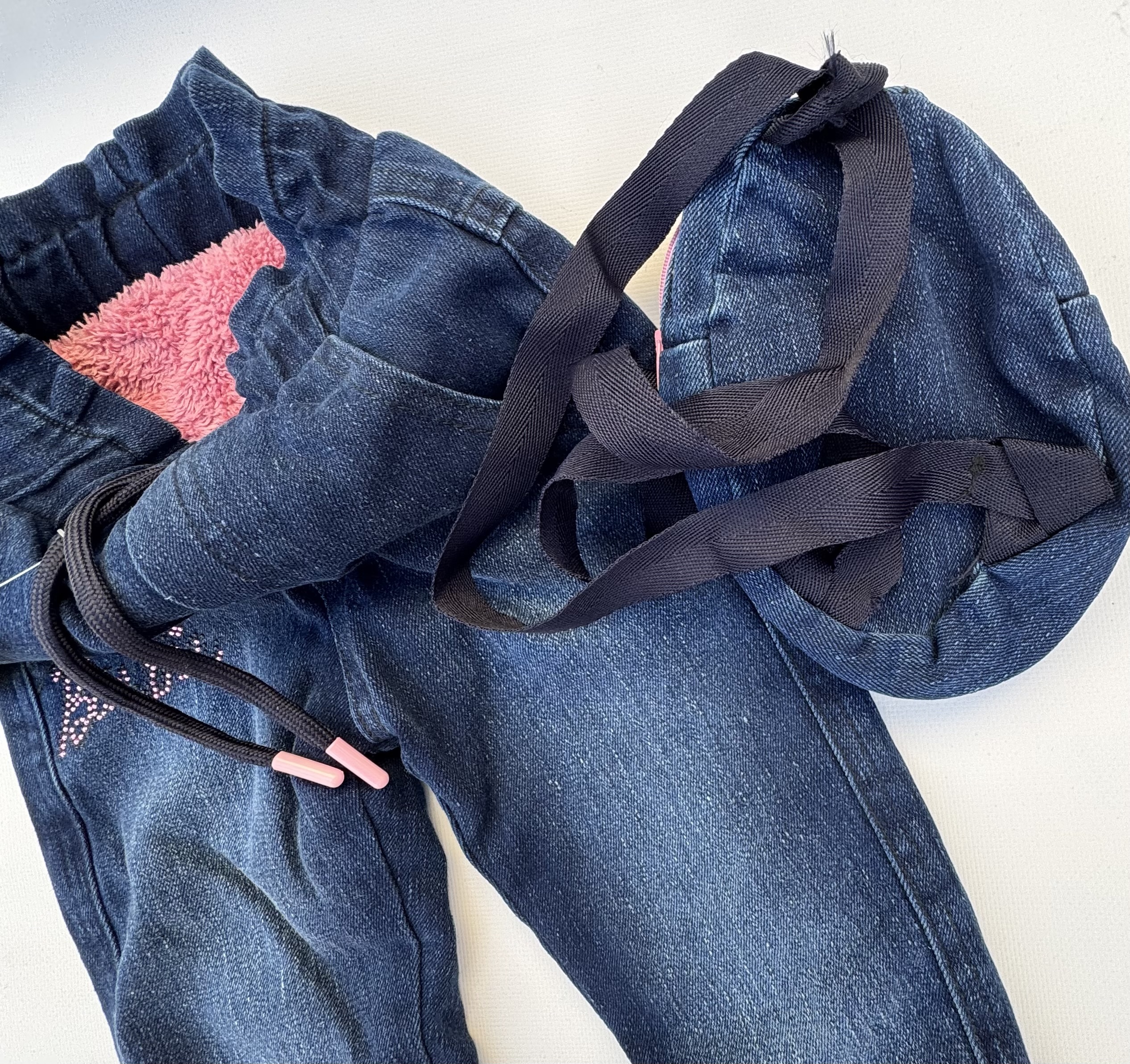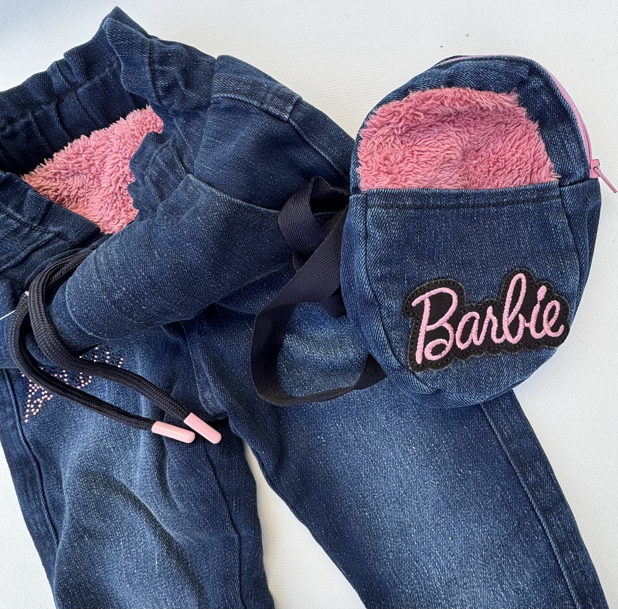 🎒 У комплекті — маленька сумочка через плече в тон джинсів, також із вишивкою “Barbie” і махровою вставкою.