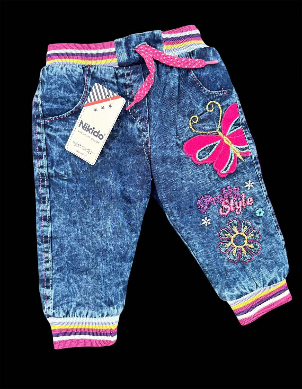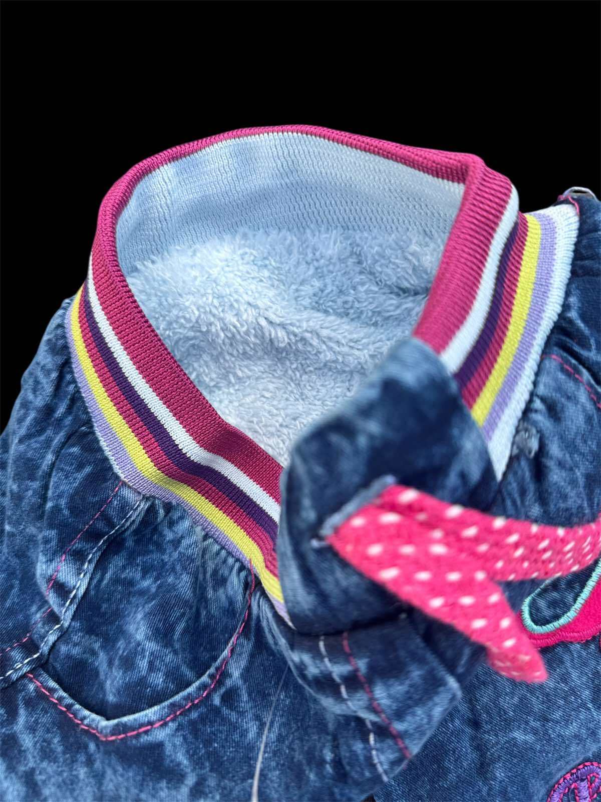 Теплі джинси на махрі для дівчинки. Дитячі джинси виконані з щільного джинсу, утеплені підкладкою з бавовняної махри, м'якої та приємною до тіла. Джинси доповнені поясом з широкої еластичної трикотажної резинки зі шнурком всередині, що дозволяє гарно зафіксувати штани на поясі дитини та уникнути постійних підтягувань. Внизу штанини на широкій еластичній трикотажній манжеті. Зручні штани мають дві кишені, декоровані вишивкою. Універсальні теплі джинси для прогулянок та активного відпочинку.