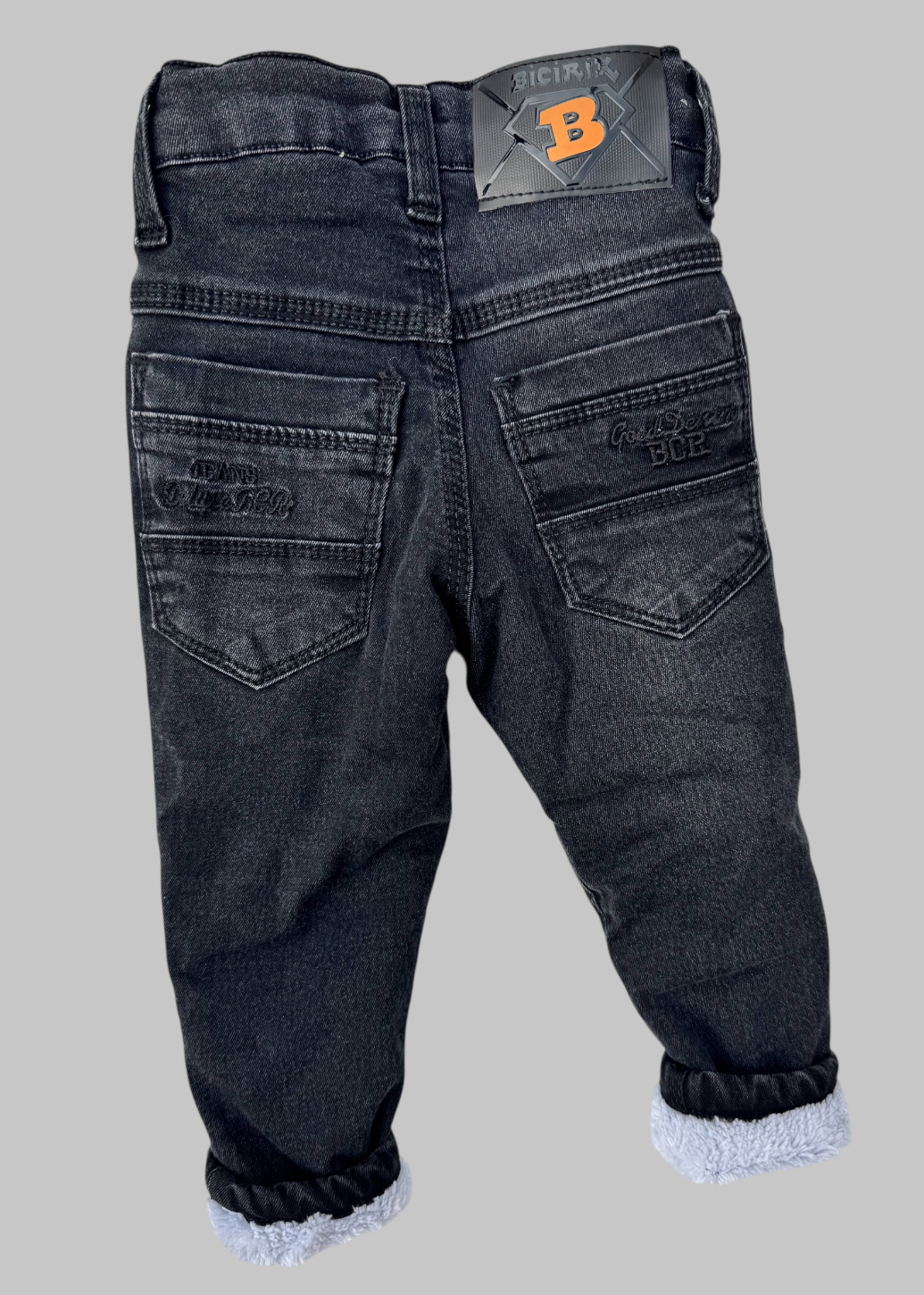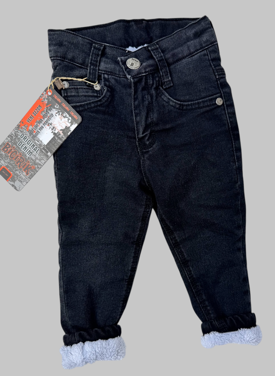 Зручні та стильні утеплені джинси для малюків. Модель виконана з якісного деніму чорного кольору з м’якою махровою підкладкою, яка забезпечує комфорт і тепло навіть у холодну пору року.