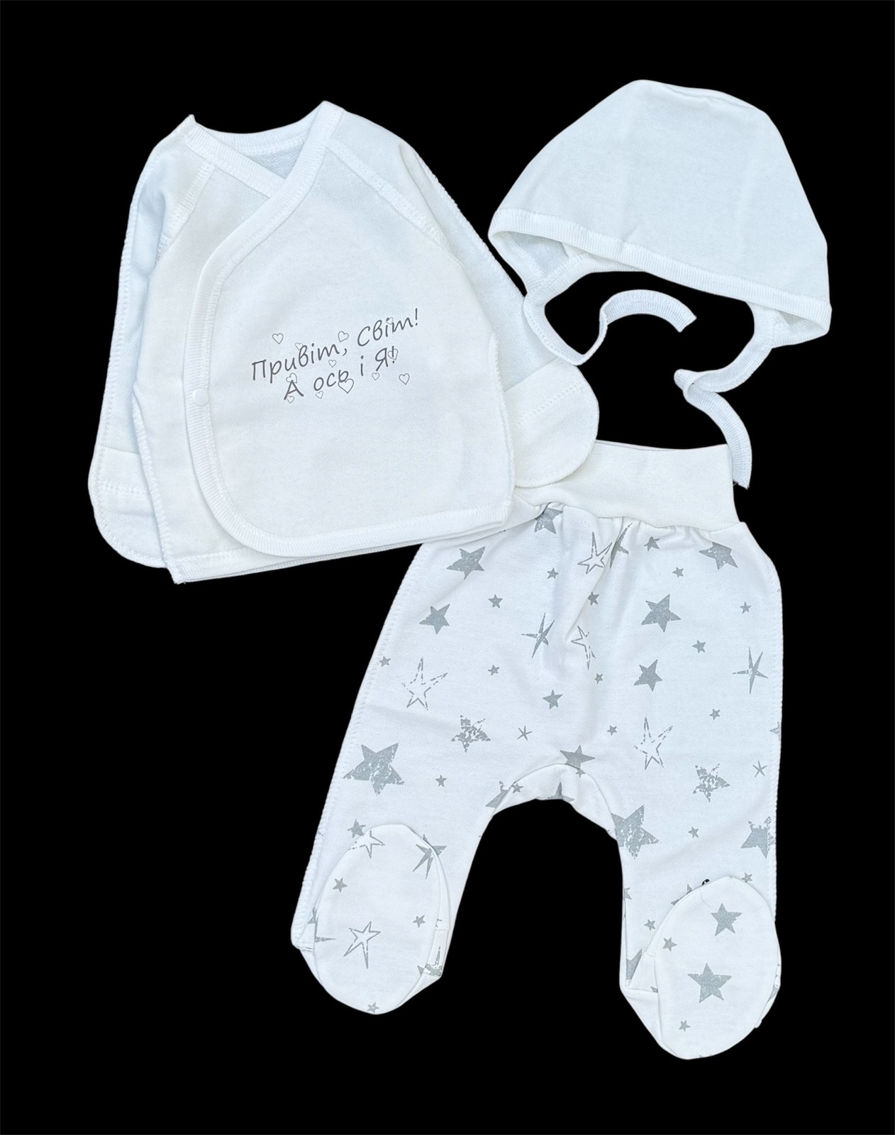 Комплект складається із сорочечки (льолі), повзунків та шапочки. Виготовлений із натуральної тканини - футер (бавовна з начосом). Футер - ніжне тепле полотно, яке добре пропускає повітря і відмінно вбирає вологу.