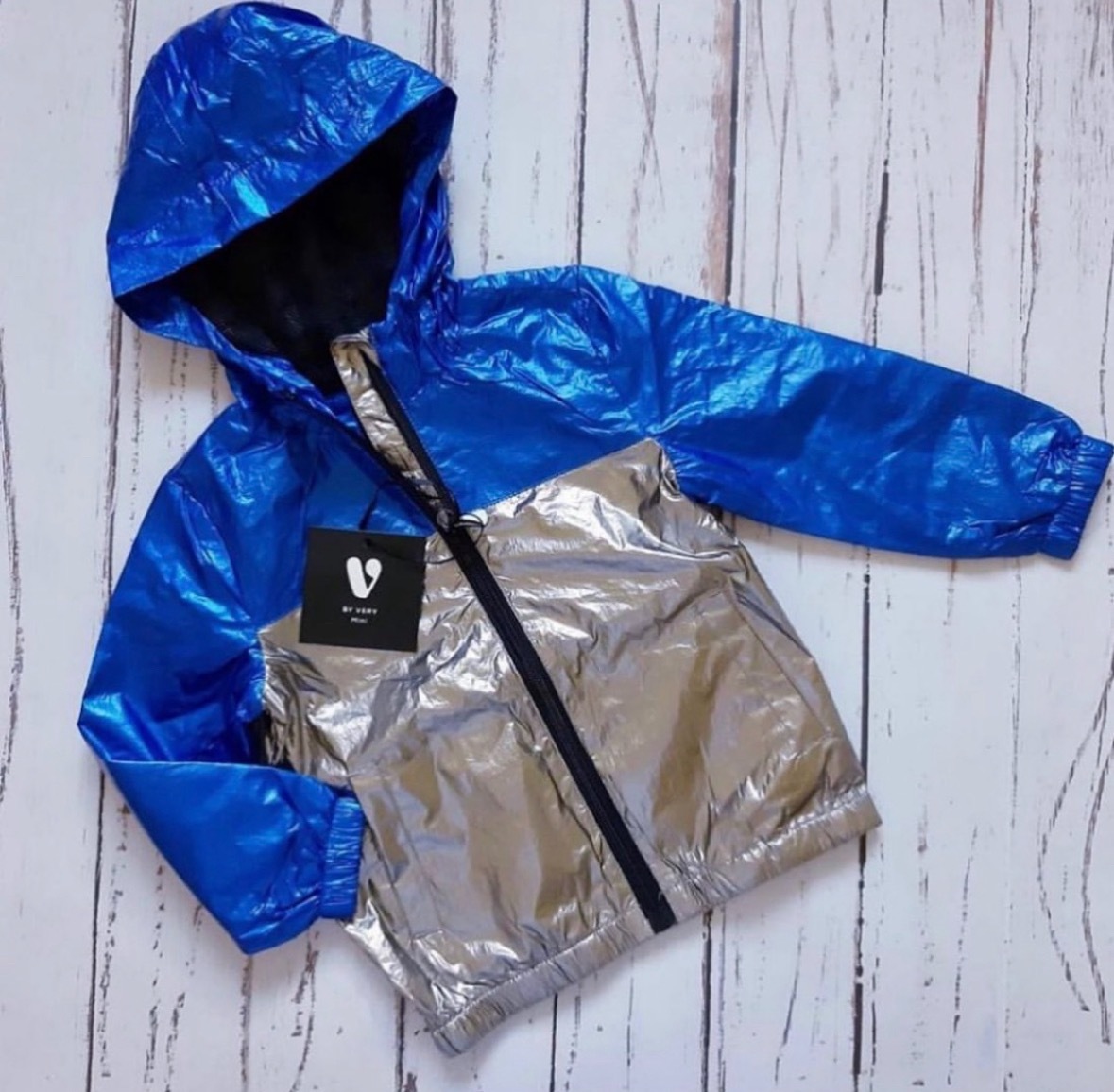 Модель із капюшоном та зручними кишенями. Дизайн поєднує два сучасні металізовані відтінки: верхня частина - синій металік, нижня - срібло. Вітрівка виглядає яскраво та модно, чудово підходить для весняно-осіннього сезону.