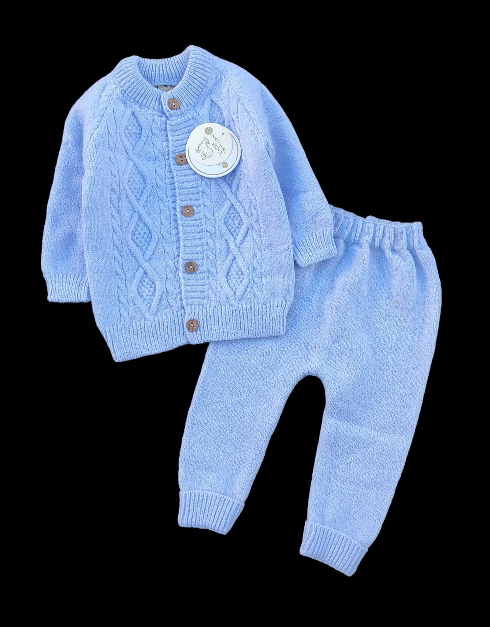 М’який в’язаний костюм для хлопчика, виконаний у блакитному кольорі. До набору входять: