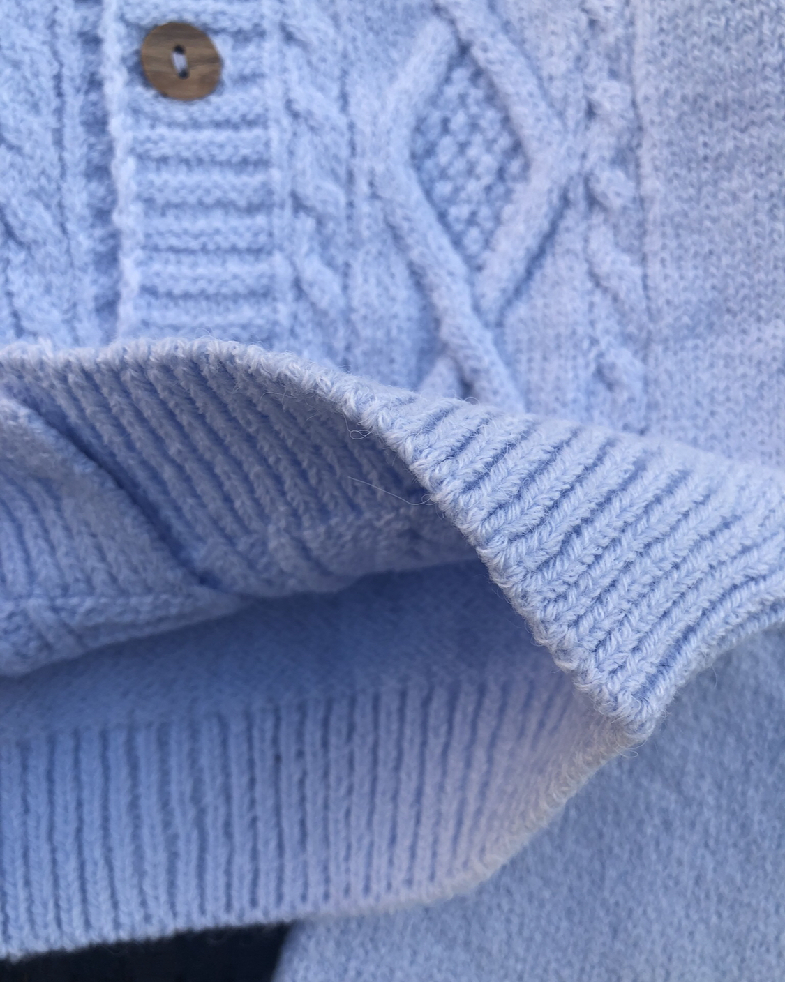 Кардиган із фактурним візерунком і дерев’яними ґудзиками по центру. Має круглий виріз і еластичні манжети, що забезпечують комфортну посадку.
