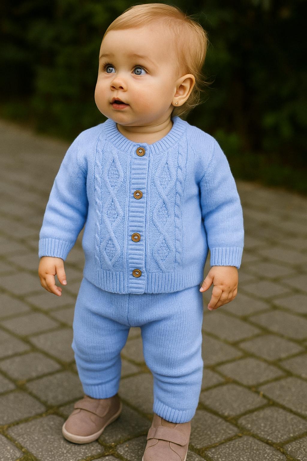 Матеріал - акрил, теплий, приємний до тіла, ідеальний для прохолодної погоди. Такий костюм чудово підходить для осінніх або зимових прогулянок та для сімейних фотосесій, створюючи затишний і стильний образ маленького модника.