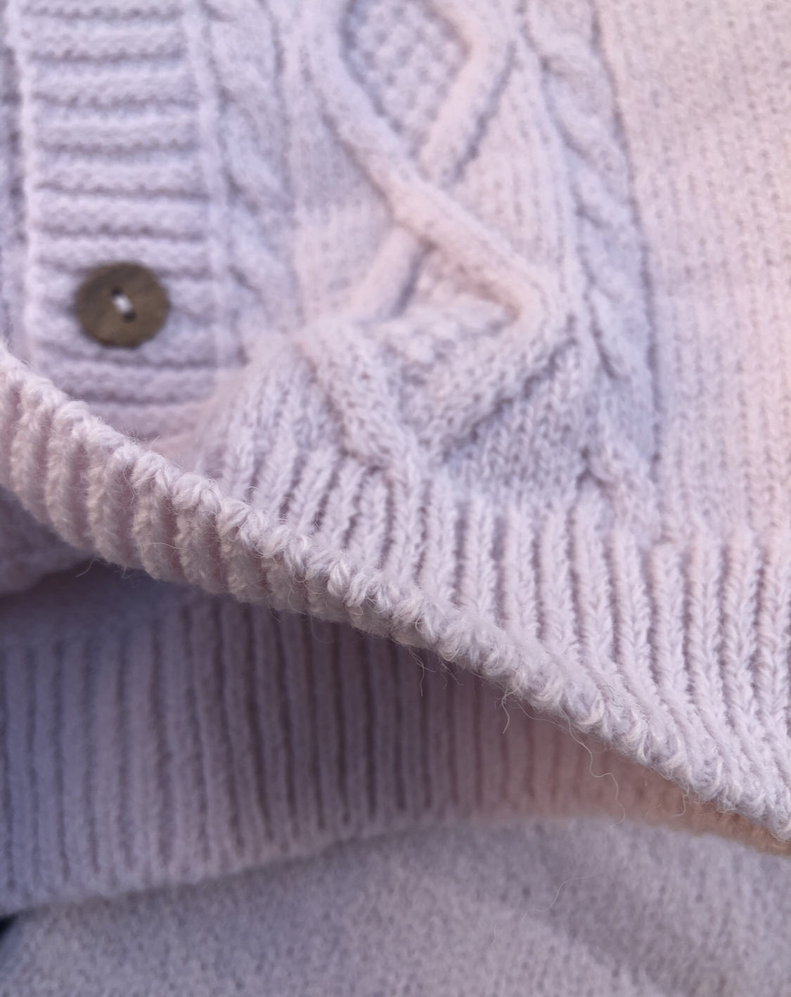 Кардиган із фактурним візерунком і дерев’яними ґудзиками по центру. Має круглий виріз і еластичні манжети, що забезпечують комфортну посадку.