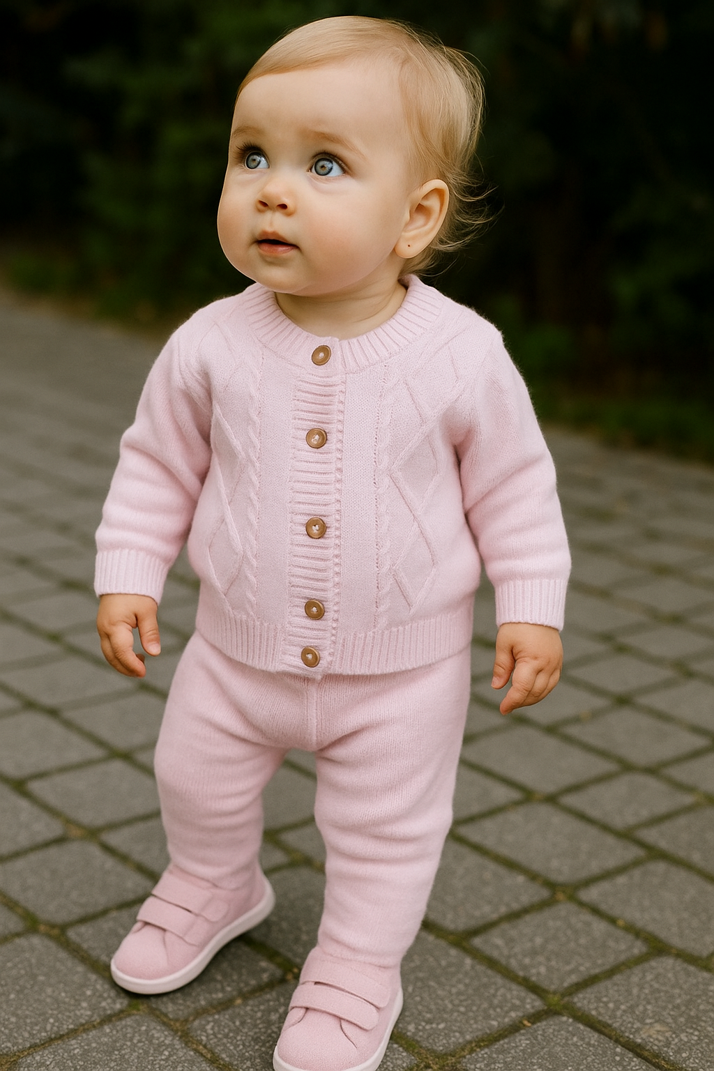 М’який в’язаний костюм для дівчинки, виконаний у світло-рожевому кольорі. До набору входять: