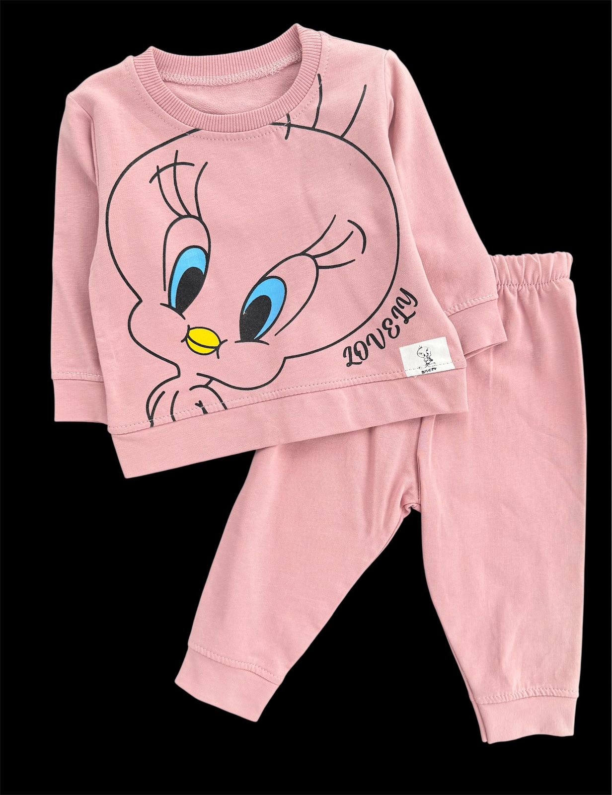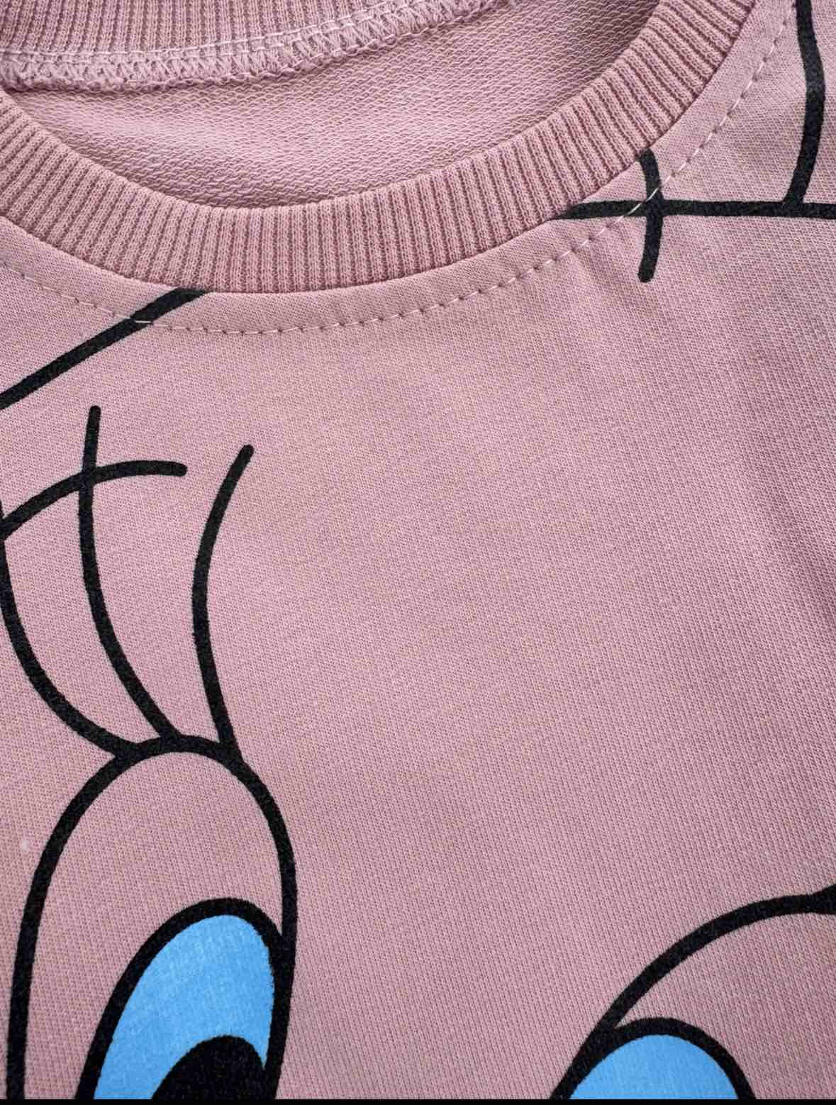 Милий та зручний костюмчик для найменших модниць. Комплект складається із світшота з яскравим принтом та зручних штанців на еластичній резинці. М’яка тканина приємна до тіла, добре пропускає повітря та не сковує рухів малюка.