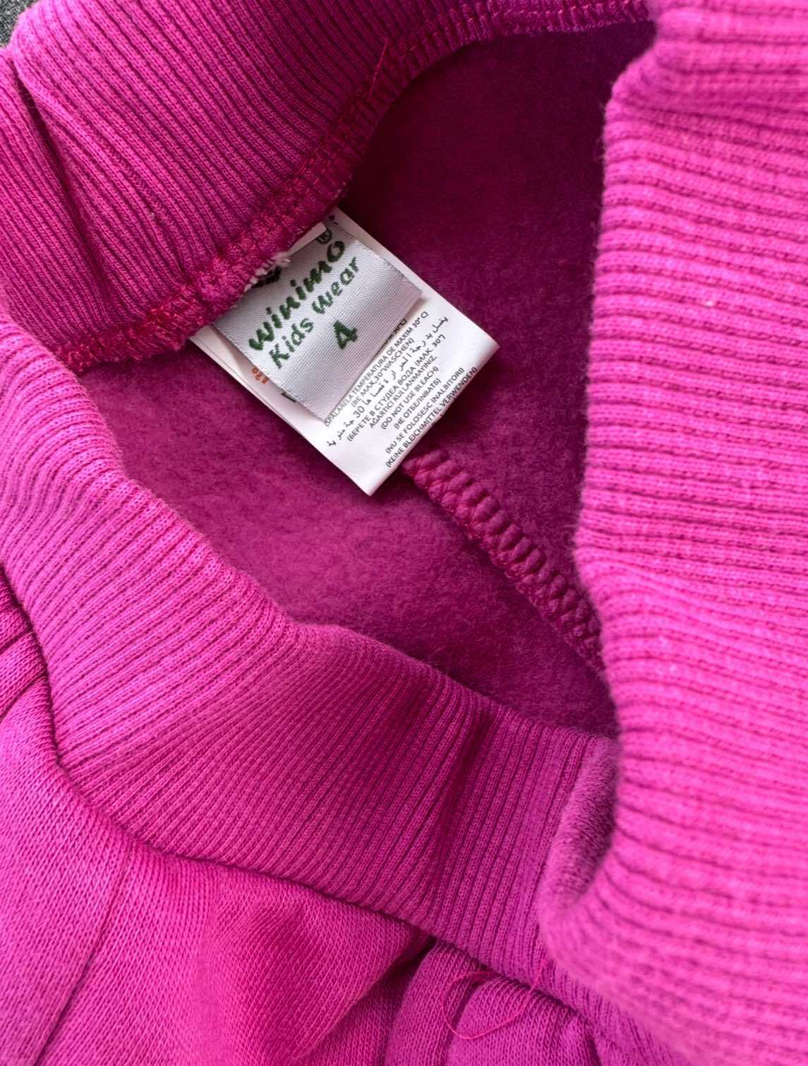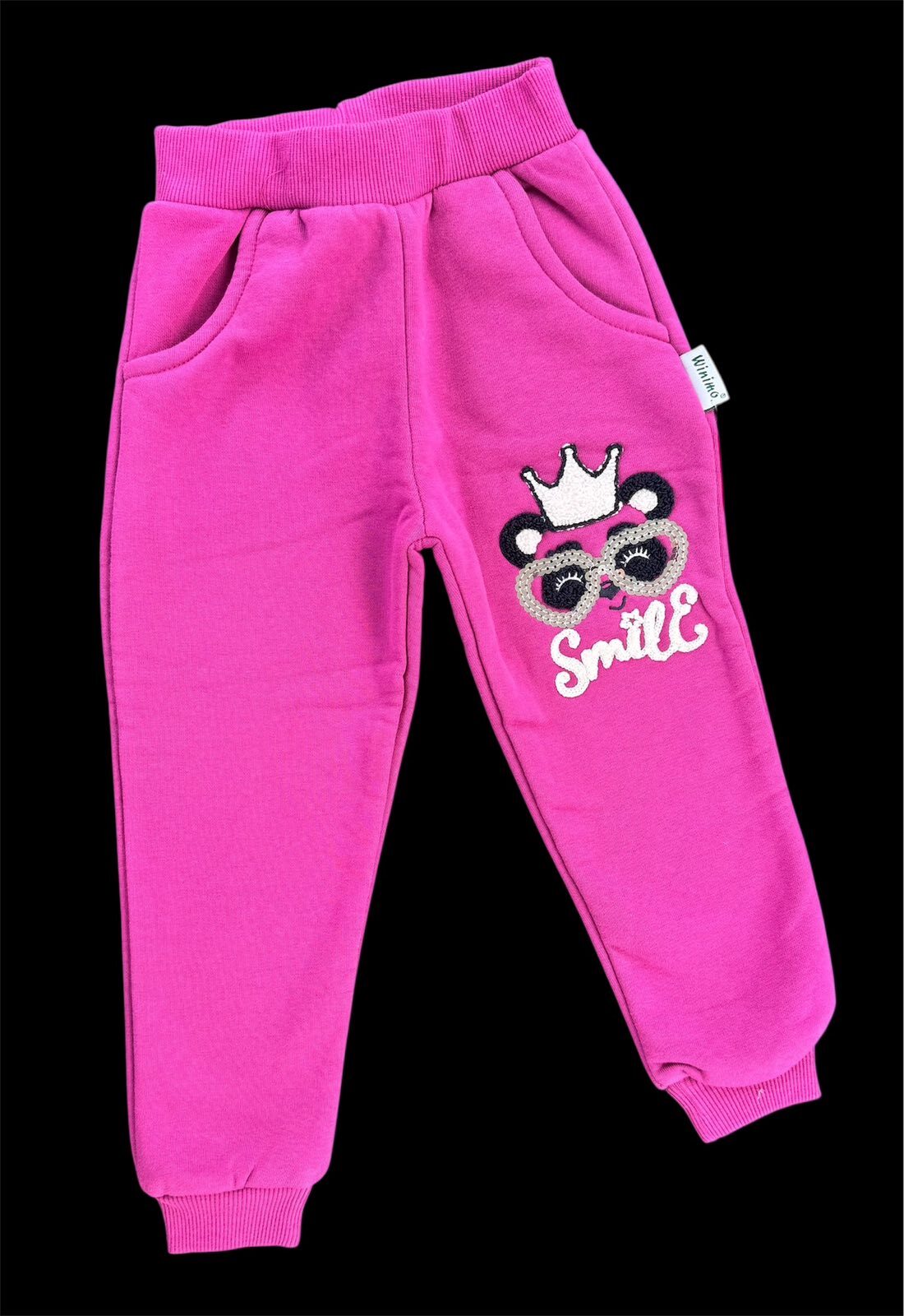Теплі штани для дівчинки. Пояс та манжети - широка еластична трикотажна резинка. Декоровані нашивкою та паєтками. Є кишені.
